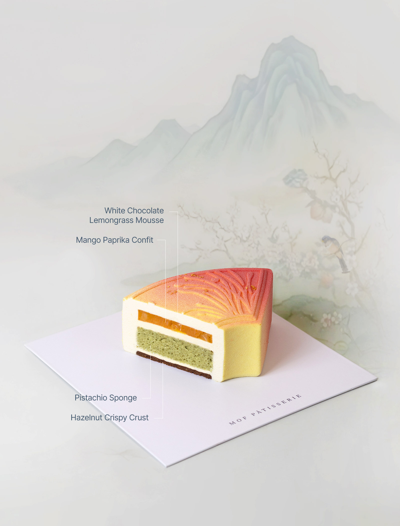 A celebration of aromatic flavours with a tinge of tropical mango sweetness, brought together by a light pistachio sponge on a crispy hazelnut crust